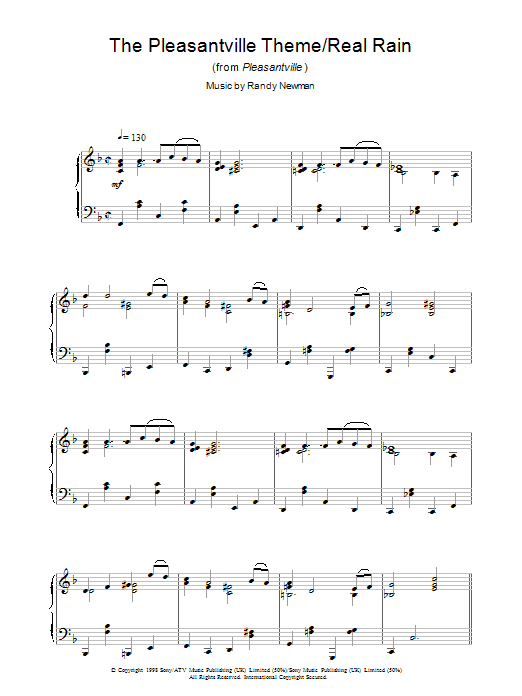 Download or print Randy Newman The Pleasantville Theme/Real Rain (from Pleasantville) sheet music, chords and digital score arranged for Piano Solo. This Film/TV score includes 7 page(s).