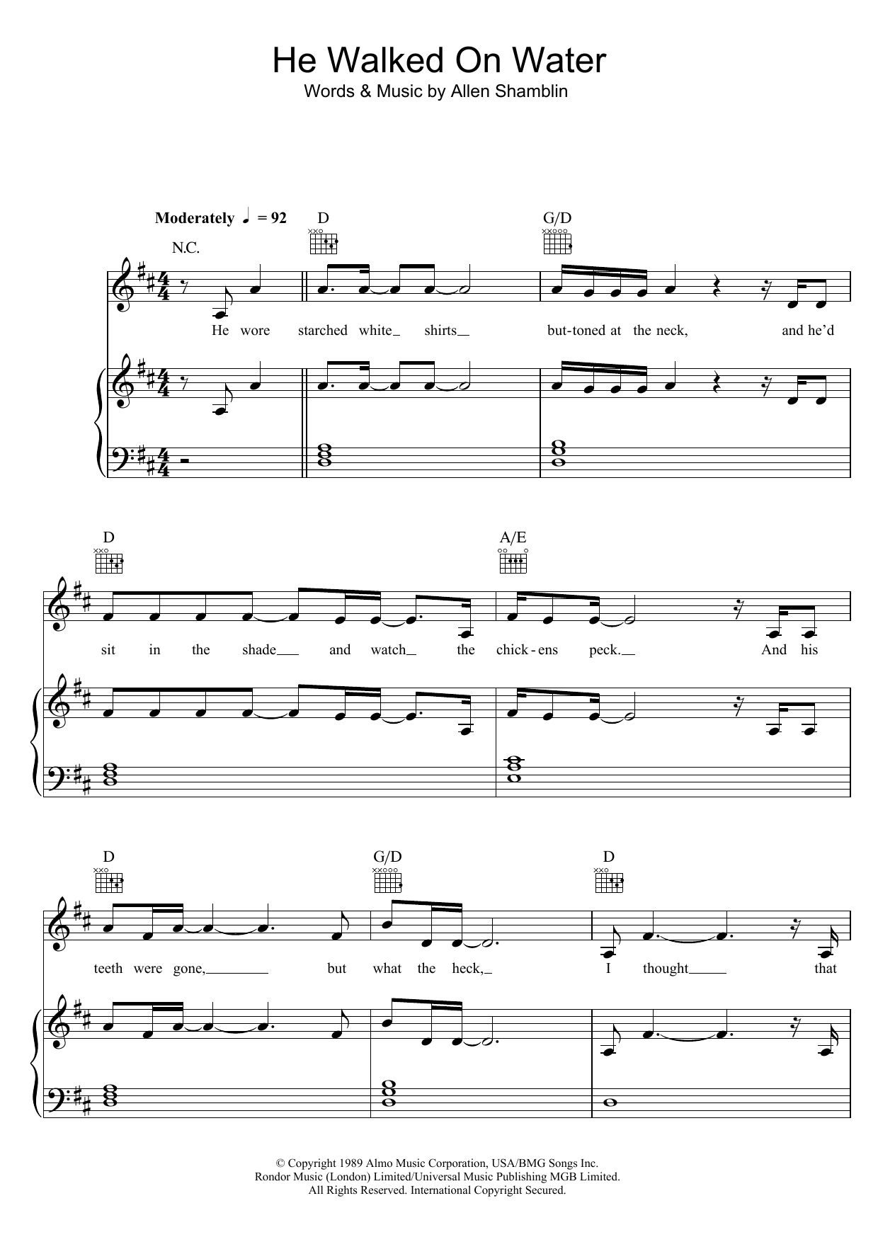 Download or print Randy Travis He Walked On Water sheet music, chords and digital score arranged for Piano, Vocal & Guitar Chords. This Country score includes 6 page(s).