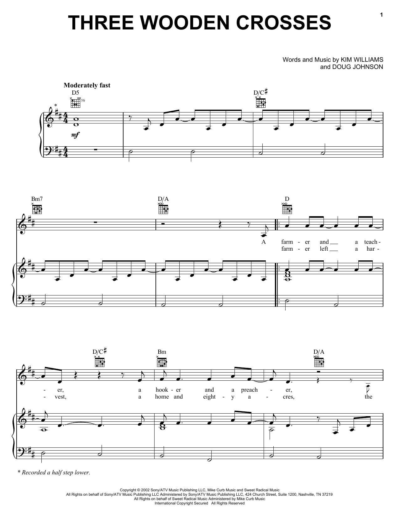 Download or print Randy Travis Three Wooden Crosses sheet music, chords and digital score arranged for Lead Sheet / Fake Book. This Country score includes 2 page(s).