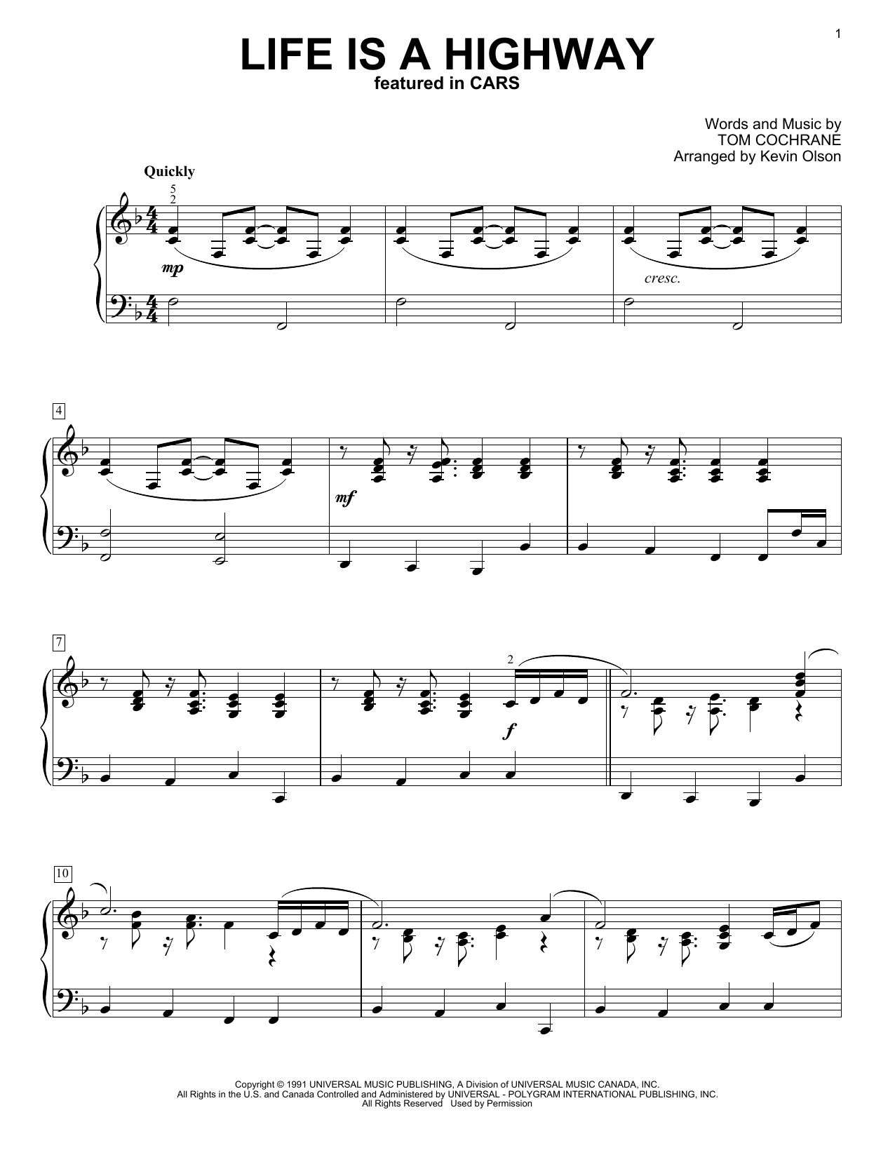 Download or print Rascal Flatts Life Is A Highway (from Cars) (arr. Kevin Olson) sheet music, chords and digital score arranged for Easy Piano Solo. This Pop score includes 4 page(s).