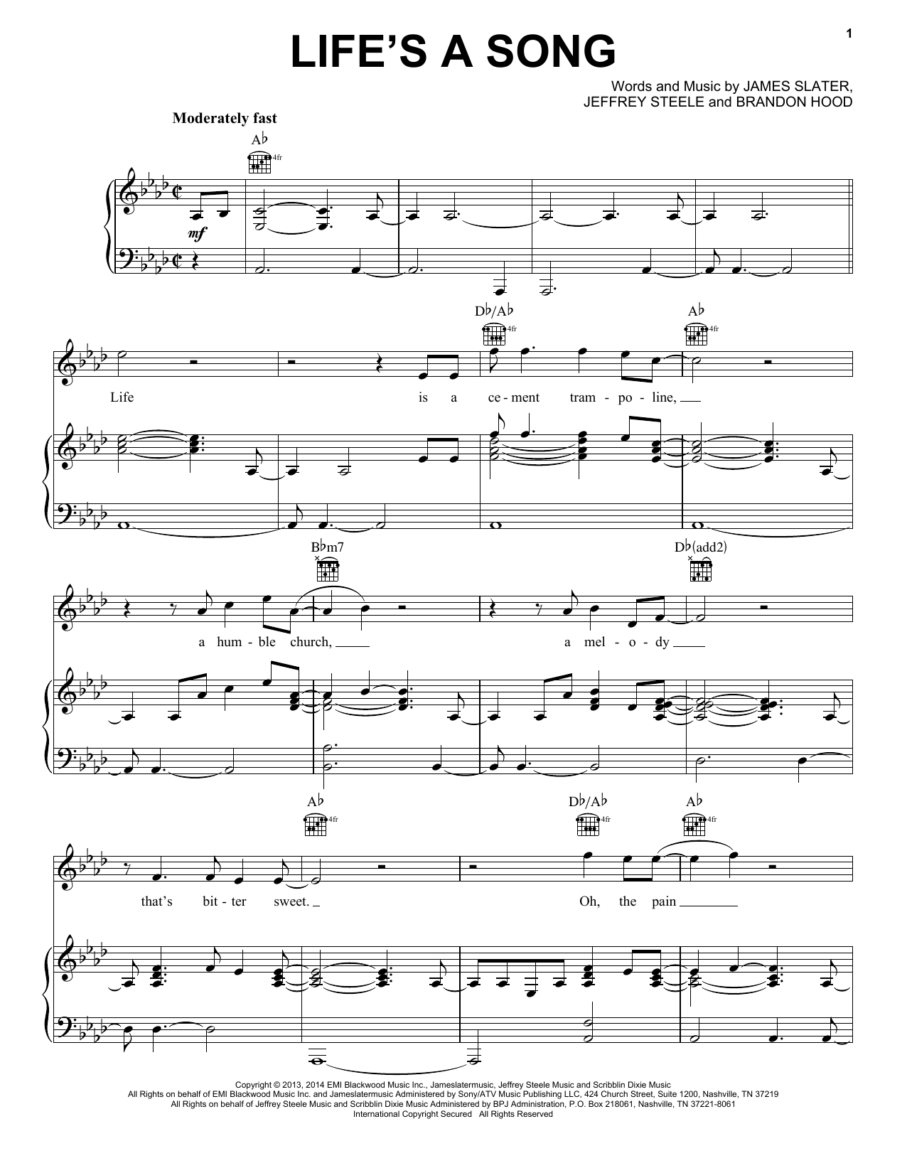 Download or print Rascal Flatts Life's A Song sheet music, chords and digital score arranged for Piano, Vocal & Guitar Chords (Right-Hand Melody). This Country score includes 9 page(s).