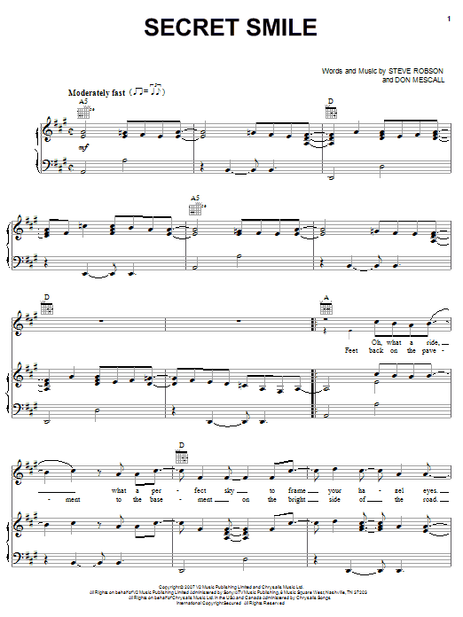 Download or print Rascal Flatts Secret Smile sheet music, chords and digital score arranged for Piano, Vocal & Guitar Chords (Right-Hand Melody). This Country score includes 7 page(s).