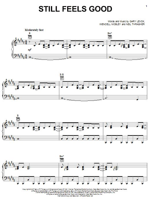 Download or print Rascal Flatts Still Feels Good sheet music, chords and digital score arranged for Piano, Vocal & Guitar Chords (Right-Hand Melody). This Country score includes 7 page(s).