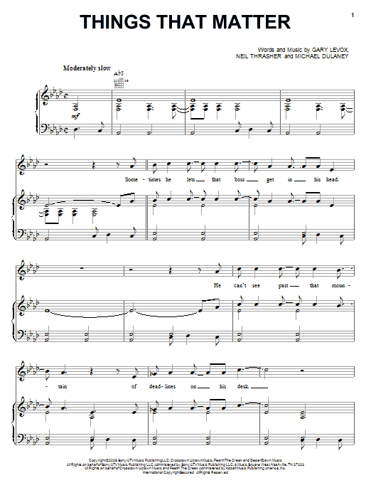 Download or print Rascal Flatts Things That Matter sheet music, chords and digital score arranged for Piano, Vocal & Guitar Chords (Right-Hand Melody). This Country score includes 9 page(s).