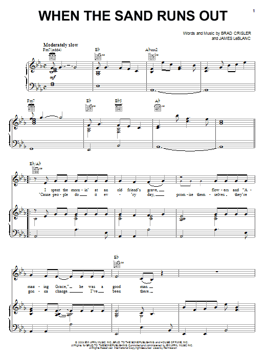 Download or print Rascal Flatts When The Sand Runs Out sheet music, chords and digital score arranged for Piano, Vocal & Guitar Chords (Right-Hand Melody). This Country score includes 6 page(s).