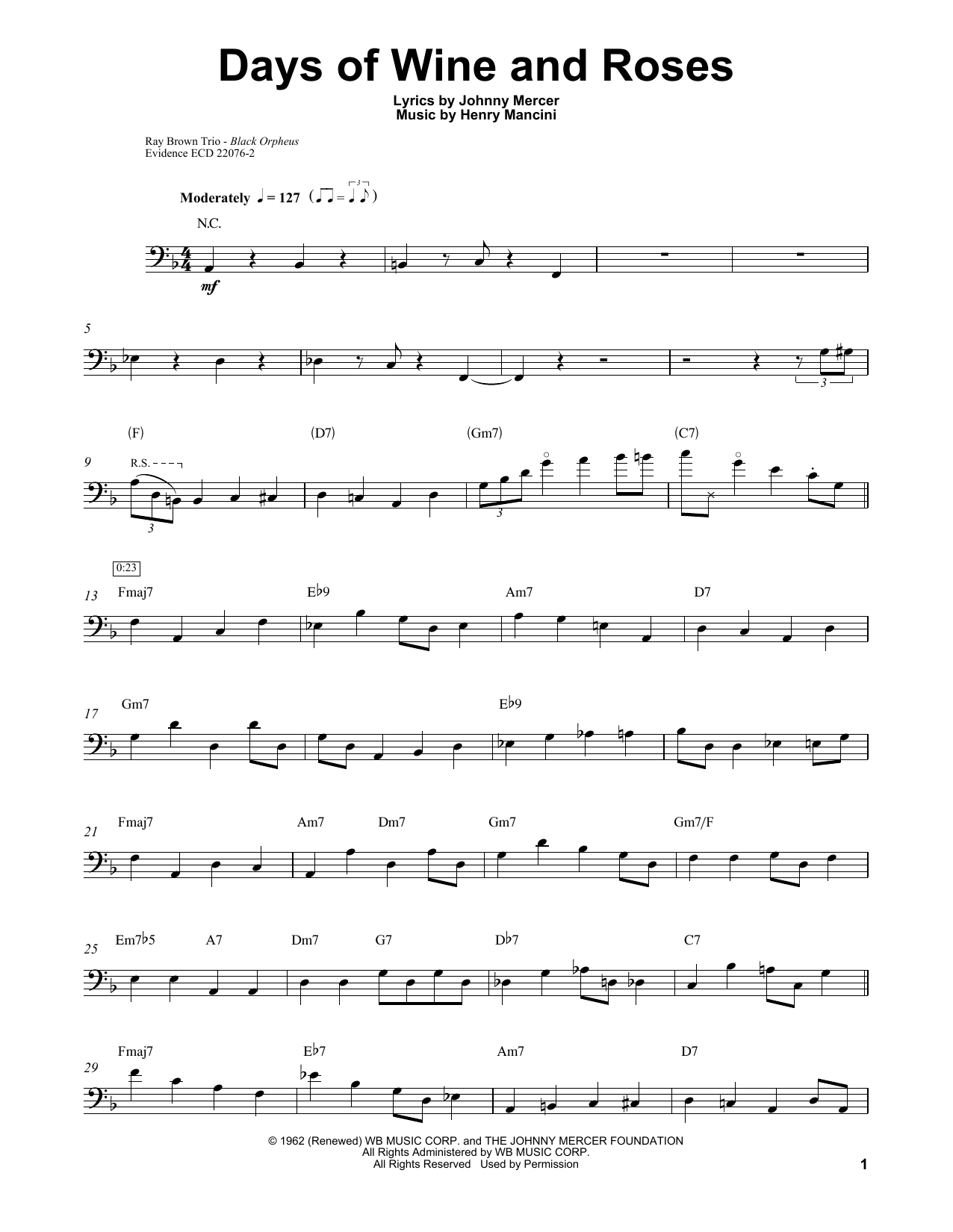 Download or print Ray Brown Days Of Wine And Roses sheet music, chords and digital score arranged for String Bass Transcription. This Jazz score includes 6 page(s).