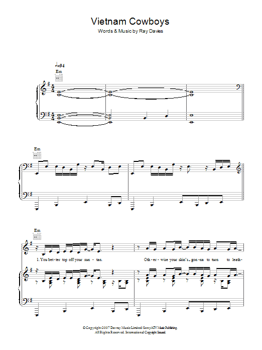 Download or print Ray Davies Vietnam Cowboys sheet music, chords and digital score arranged for Piano, Vocal & Guitar Chords. This Pop score includes 11 page(s).