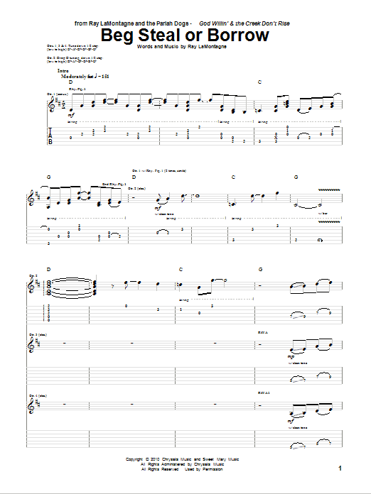 Download or print Ray LaMontagne and The Pariah Dogs Beg Steal Or Borrow sheet music, chords and digital score arranged for Piano, Vocal & Guitar Chords (Right-Hand Melody). This Folk score includes 9 page(s).