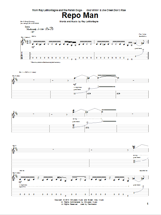 Download or print Ray LaMontagne and The Pariah Dogs Repo Man sheet music, chords and digital score arranged for Guitar Tab. This Pop score includes 14 page(s).