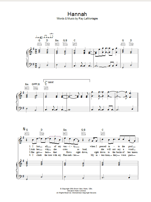 Download or print Ray LaMontagne Hannah sheet music, chords and digital score arranged for Guitar Tab. This Folk score includes 7 page(s).