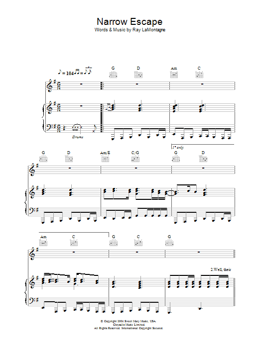 Download or print Ray LaMontagne Narrow Escape sheet music, chords and digital score arranged for Guitar Tab. This Folk score includes 7 page(s).
