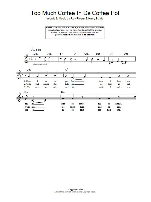 Download or print Ray Rivera Too Much Coffee In De Coffee Pot sheet music, chords and digital score arranged for Lead Sheet / Fake Book. This Standards score includes 2 page(s).