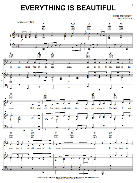 Download or print Ray Stevens Everything Is Beautiful sheet music, chords and digital score arranged for Piano, Vocal & Guitar Chords (Right-Hand Melody). This Pop score includes 4 page(s).