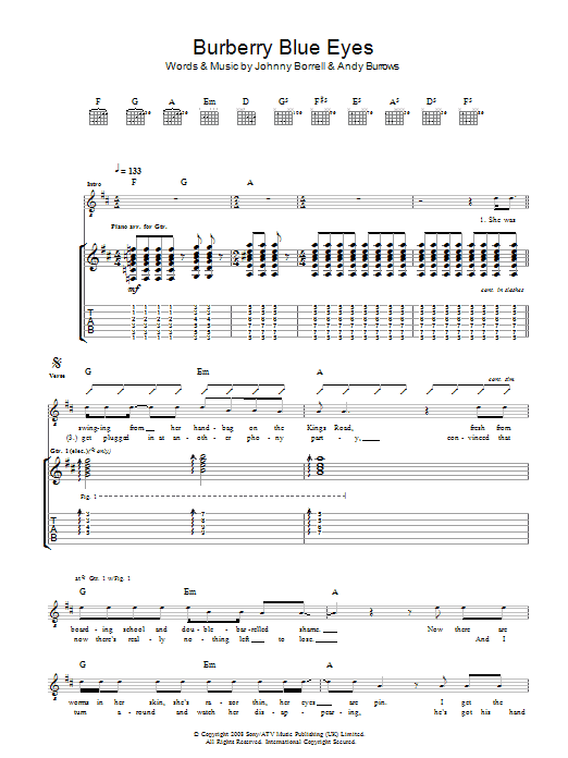 Download or print Razorlight Burberry Blue Eyes sheet music, chords and digital score arranged for Guitar Tab. This Rock score includes 8 page(s).