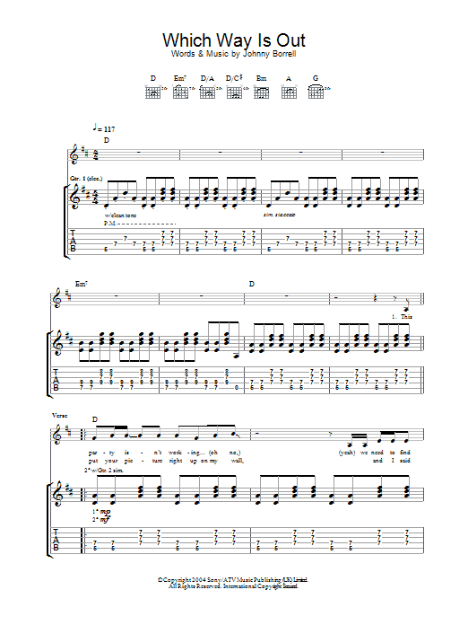 Download or print Razorlight Which Way Is Out sheet music, chords and digital score arranged for Guitar Tab. This Rock score includes 5 page(s).