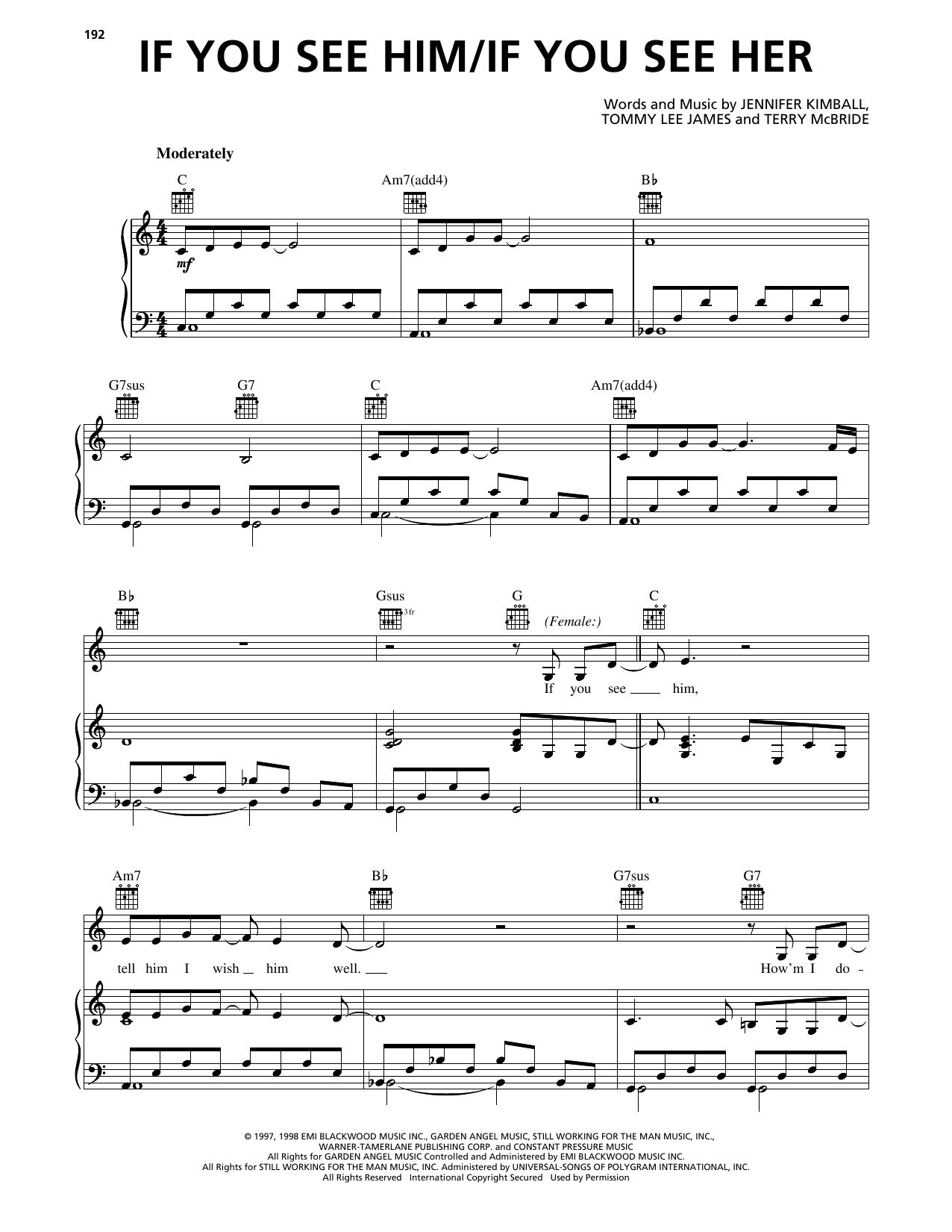 Download or print Reba McEntire If You See Him/If You See Her sheet music, chords and digital score arranged for Piano, Vocal & Guitar Chords (Right-Hand Melody). This Country score includes 6 page(s).