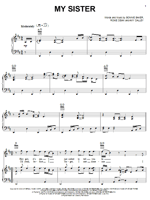 Download or print Reba McEntire My Sister sheet music, chords and digital score arranged for Piano, Vocal & Guitar Chords (Right-Hand Melody). This Country score includes 6 page(s).