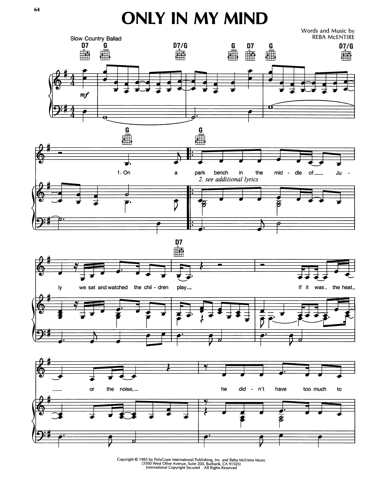 Download or print Reba McEntire Only In My Mind sheet music, chords and digital score arranged for Piano, Vocal & Guitar Chords (Right-Hand Melody). This Country score includes 4 page(s).