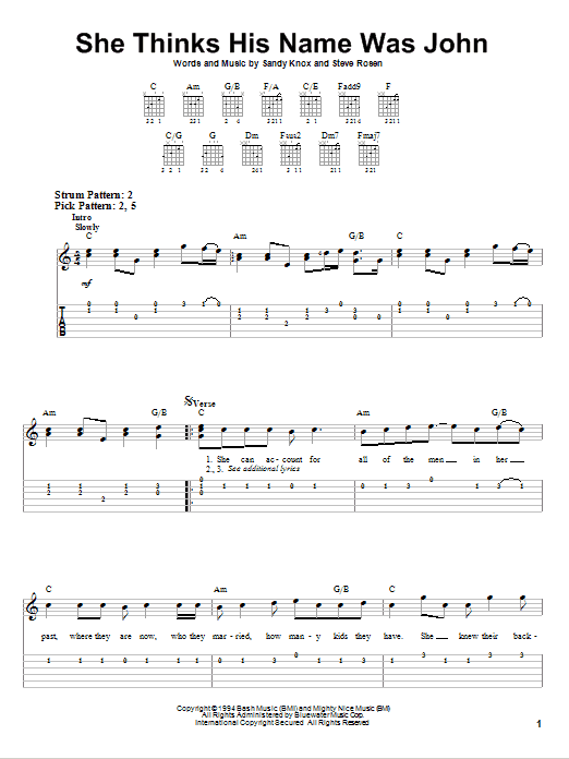 Download or print Reba McEntire She Thinks His Name Was John sheet music, chords and digital score arranged for Easy Guitar Tab. This Country score includes 3 page(s).