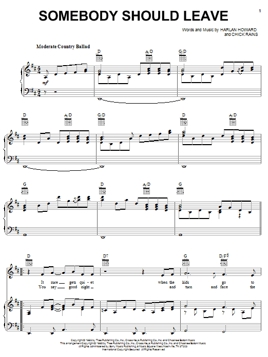 Download or print Reba McEntire Somebody Should Leave sheet music, chords and digital score arranged for Piano, Vocal & Guitar Chords (Right-Hand Melody). This Country score includes 5 page(s).