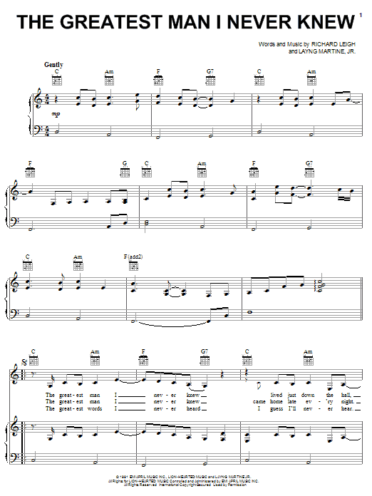 Download or print Reba McEntire The Greatest Man I Never Knew sheet music, chords and digital score arranged for Piano, Vocal & Guitar Chords (Right-Hand Melody). This Country score includes 3 page(s).