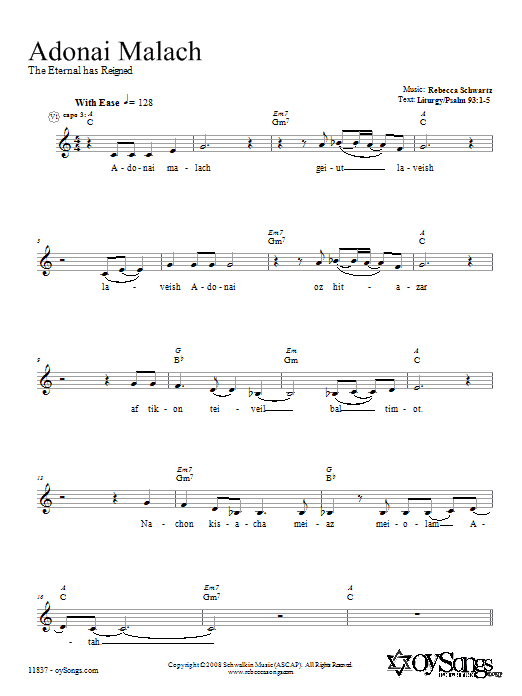 Download or print Rebecca Schwartz Adonai Malach sheet music, chords and digital score arranged for Lead Sheet / Fake Book. This Traditional score includes 3 page(s).