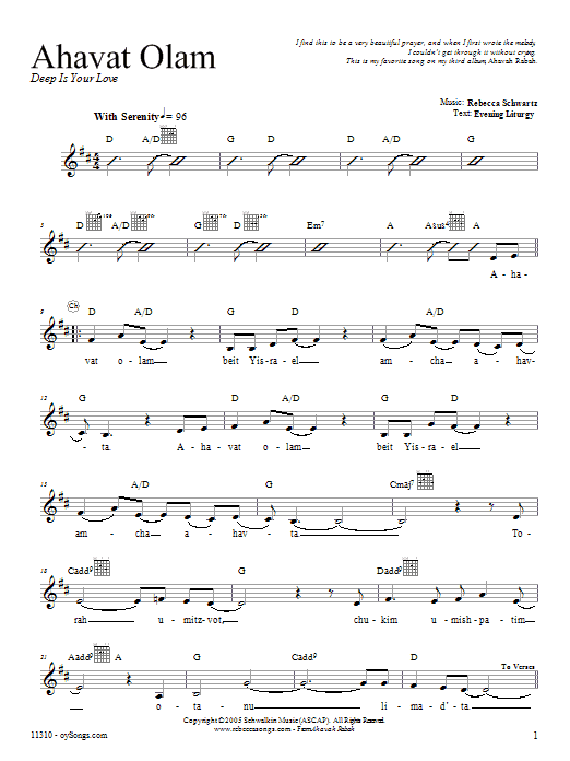 Download or print Rebecca Schwartz Ahavat Olam sheet music, chords and digital score arranged for Lead Sheet / Fake Book. This Traditional score includes 3 page(s).