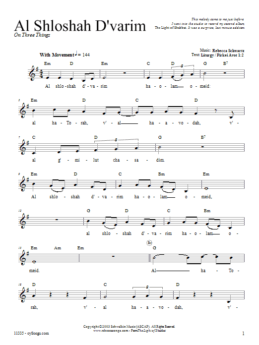 Download or print Rebecca Schwartz Al Sh'loshah D'varim sheet music, chords and digital score arranged for Lead Sheet / Fake Book. This Traditional score includes 2 page(s).
