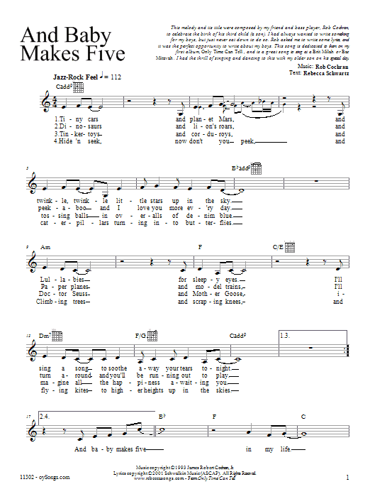Download or print Rebecca Schwartz And Baby Makes Five sheet music, chords and digital score arranged for Lead Sheet / Fake Book. This Traditional score includes 2 page(s).
