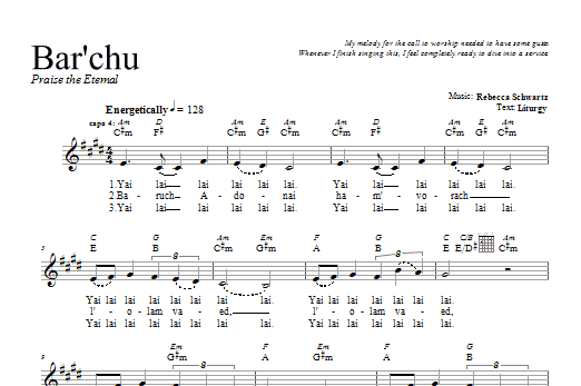 Download or print Rebecca Schwartz Bar'chu sheet music, chords and digital score arranged for Lead Sheet / Fake Book. This Traditional score includes 1 page(s).