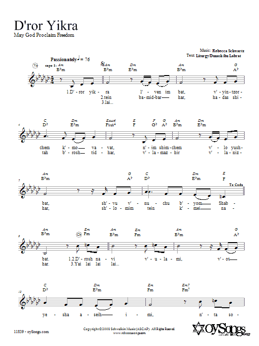 Download or print Rebecca Schwartz D'ror Yikra sheet music, chords and digital score arranged for Lead Sheet / Fake Book. This Pop score includes 2 page(s).