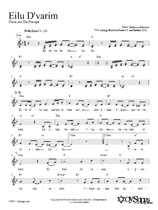 Download or print Rebecca Schwartz Eilu D'varim sheet music, chords and digital score arranged for Lead Sheet / Fake Book. This Traditional score includes 2 page(s).