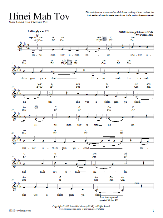 Download or print Rebecca Schwartz Hinei Mah Tov sheet music, chords and digital score arranged for Lead Sheet / Fake Book. This Traditional score includes 3 page(s).