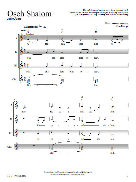 Download or print Rebecca Schwartz Oseh Shalom sheet music, chords and digital score arranged for Lead Sheet / Fake Book. This Traditional score includes 2 page(s).