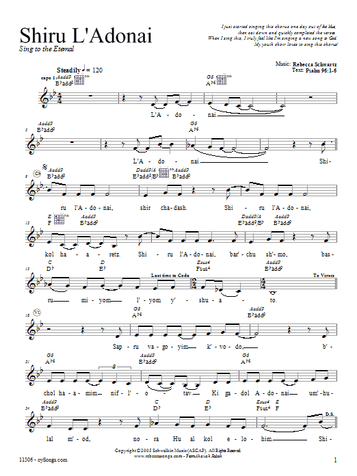 Download or print Rebecca Schwartz Shiru L'Adonai sheet music, chords and digital score arranged for Lead Sheet / Fake Book. This Traditional score includes 3 page(s).