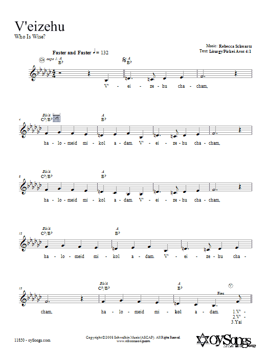 Download or print Rebecca Schwartz V'eizehu sheet music, chords and digital score arranged for Lead Sheet / Fake Book. This Traditional score includes 2 page(s).