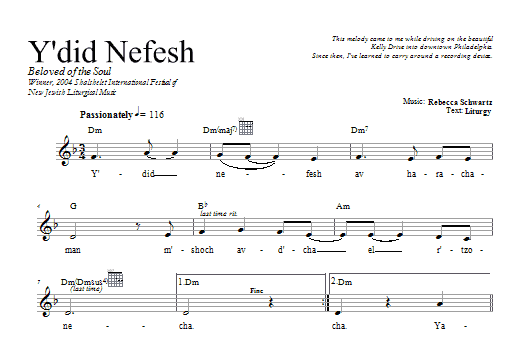Download or print Rebecca Schwartz Y'did Nefesh sheet music, chords and digital score arranged for Lead Sheet / Fake Book. This Traditional score includes 1 page(s).