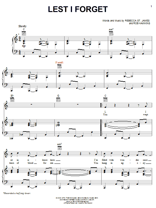 Download or print Rebecca St. James Lest I Forget sheet music, chords and digital score arranged for Piano, Vocal & Guitar Chords (Right-Hand Melody). This Christian score includes 5 page(s).