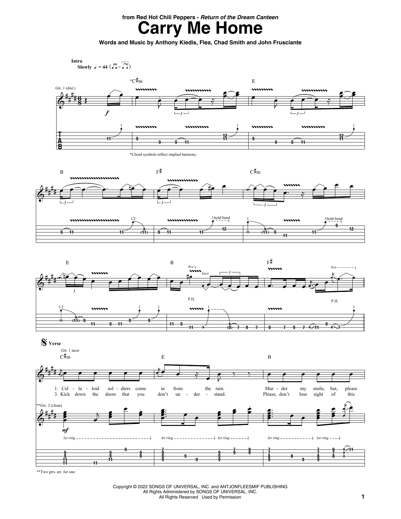 Download or print Red Hot Chili Peppers Carry Me Home sheet music, chords and digital score arranged for Guitar Tab. This Rock score includes 5 page(s).