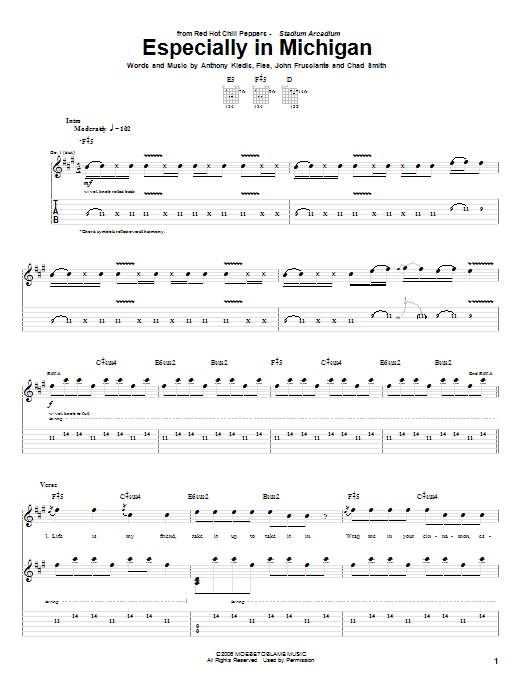 Download or print Red Hot Chili Peppers Especially In Michigan sheet music, chords and digital score arranged for Guitar Tab. This Pop score includes 13 page(s).