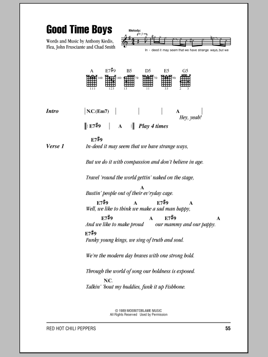 Download or print Red Hot Chili Peppers Good Time Boys sheet music, chords and digital score arranged for Guitar Tab. This Funk score includes 9 page(s).