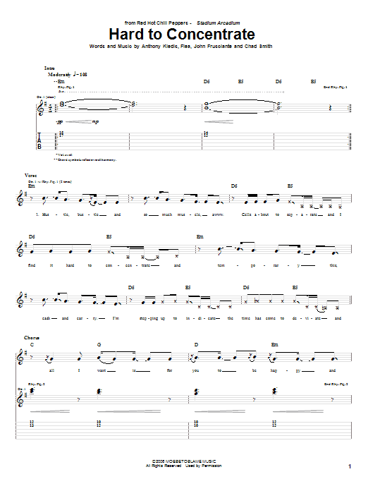 Download or print Red Hot Chili Peppers Hard To Concentrate sheet music, chords and digital score arranged for Guitar Tab. This Pop score includes 15 page(s).