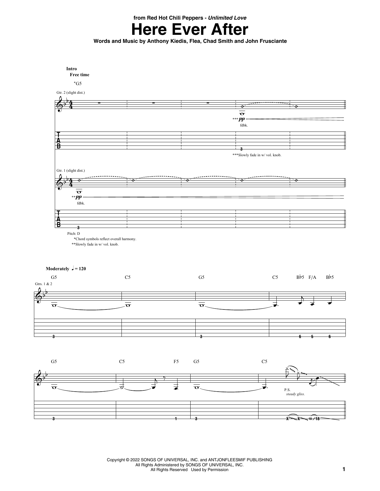 Download or print Red Hot Chili Peppers Here Ever After sheet music, chords and digital score arranged for Guitar Tab. This Rock score includes 9 page(s).