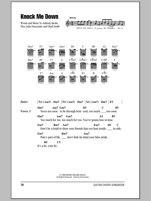 Download or print Red Hot Chili Peppers Knock Me Down sheet music, chords and digital score arranged for Piano, Vocal & Guitar Chords (Right-Hand Melody). This Rock score includes 6 page(s).