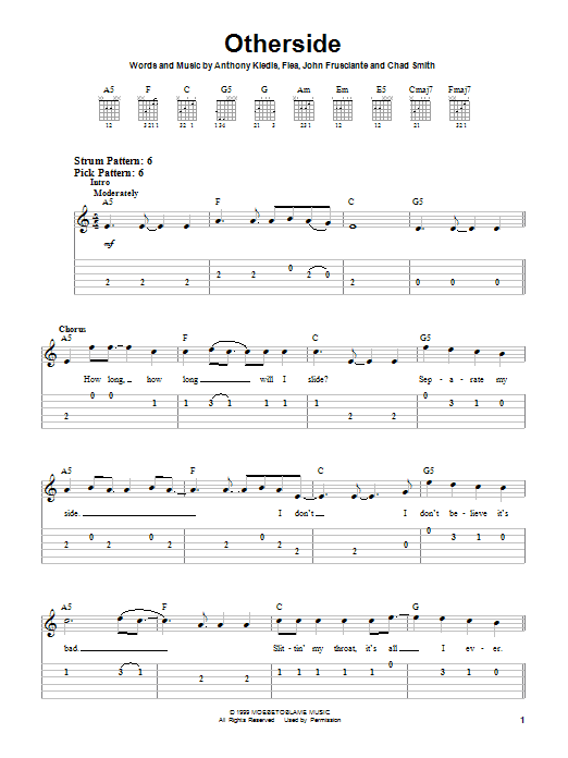 Download or print Red Hot Chili Peppers Otherside sheet music, chords and digital score arranged for Guitar Lead Sheet. This Alternative score includes 2 page(s).