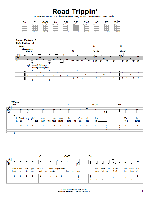 Download or print Red Hot Chili Peppers Road Trippin' sheet music, chords and digital score arranged for Guitar Chords/Lyrics. This Rock score includes 3 page(s).