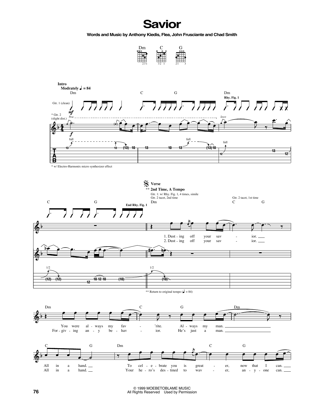 Download or print Red Hot Chili Peppers Savior sheet music, chords and digital score arranged for Guitar Tab. This Alternative score includes 5 page(s).