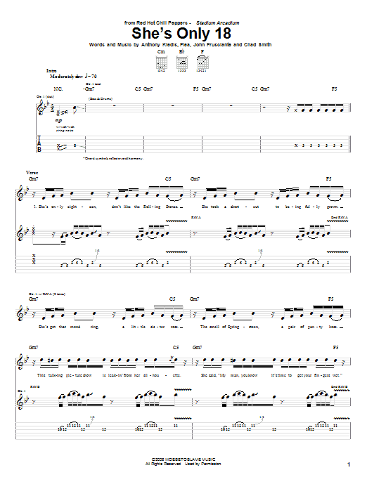 Download or print Red Hot Chili Peppers She's Only 18 sheet music, chords and digital score arranged for Guitar Tab. This Pop score includes 7 page(s).
