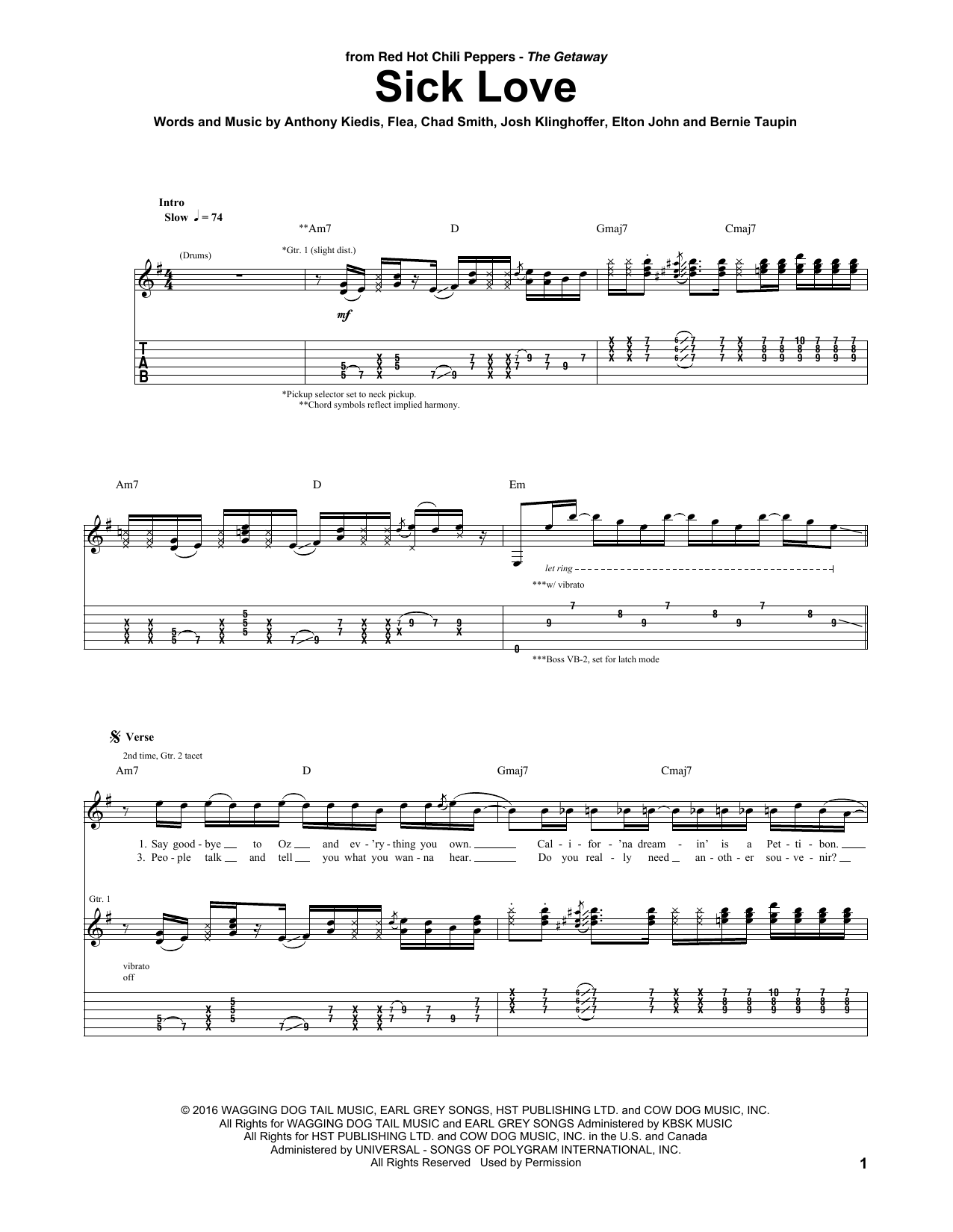 Download or print Red Hot Chili Peppers Sick Love sheet music, chords and digital score arranged for Guitar Tab. This Pop score includes 8 page(s).