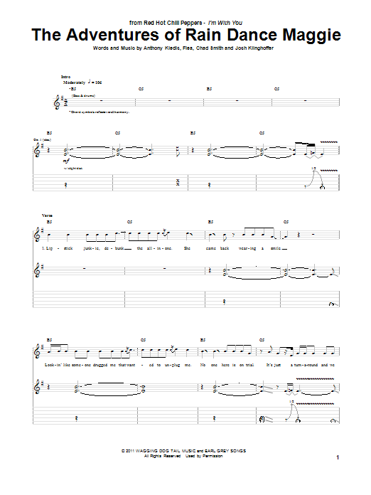 Download or print Red Hot Chili Peppers The Adventures Of Rain Dance Maggie sheet music, chords and digital score arranged for Guitar Tab. This Pop score includes 14 page(s).